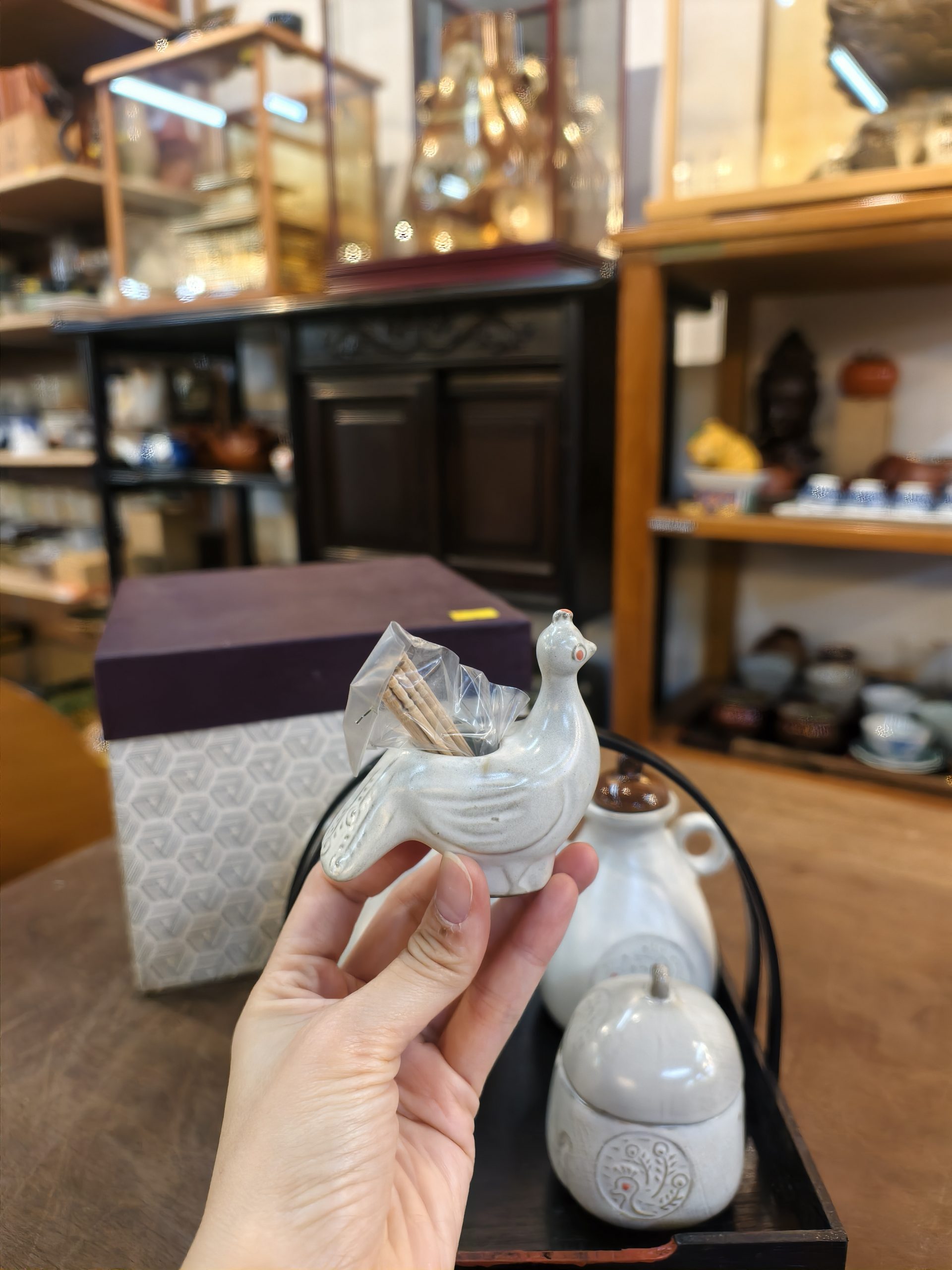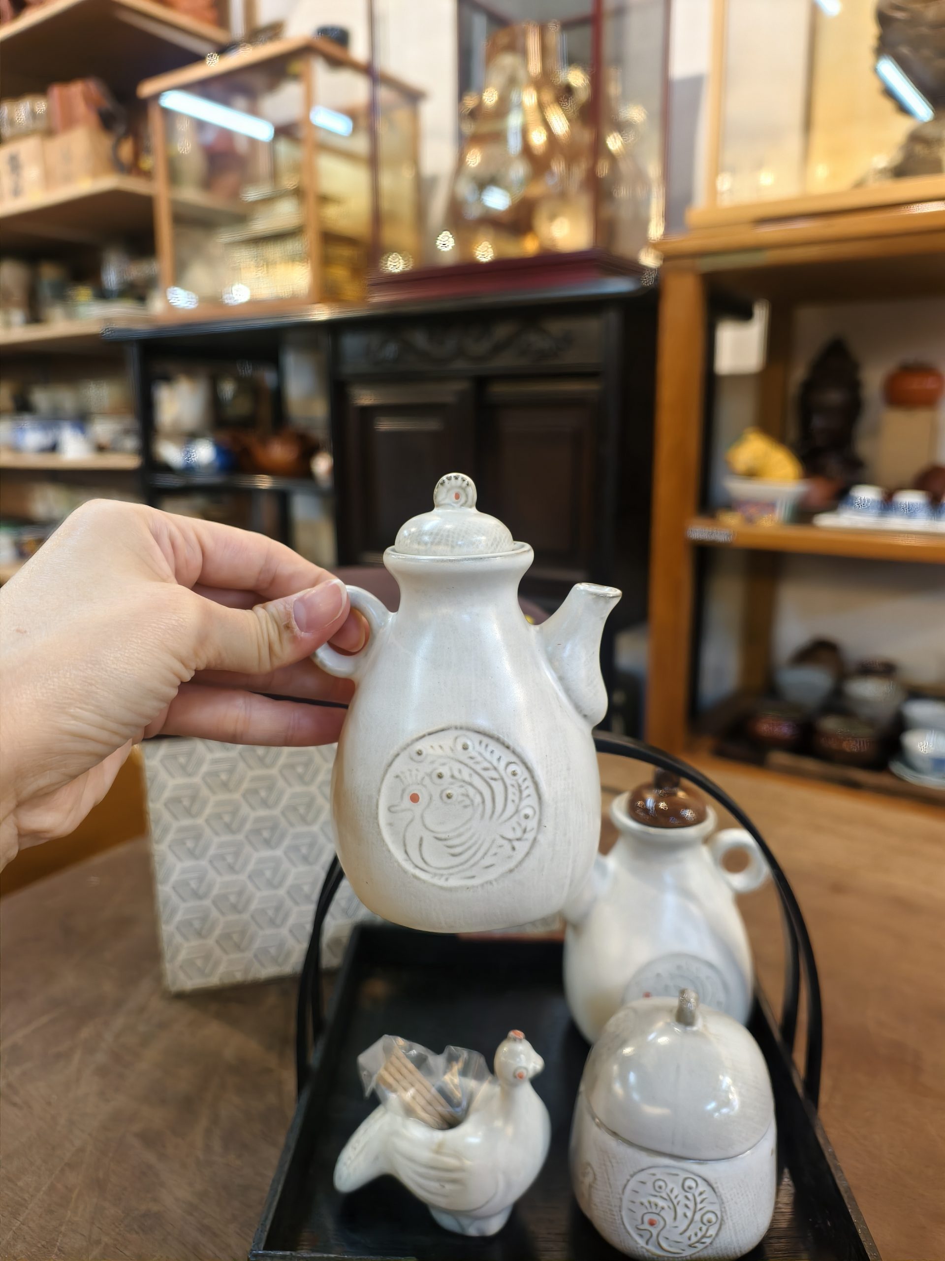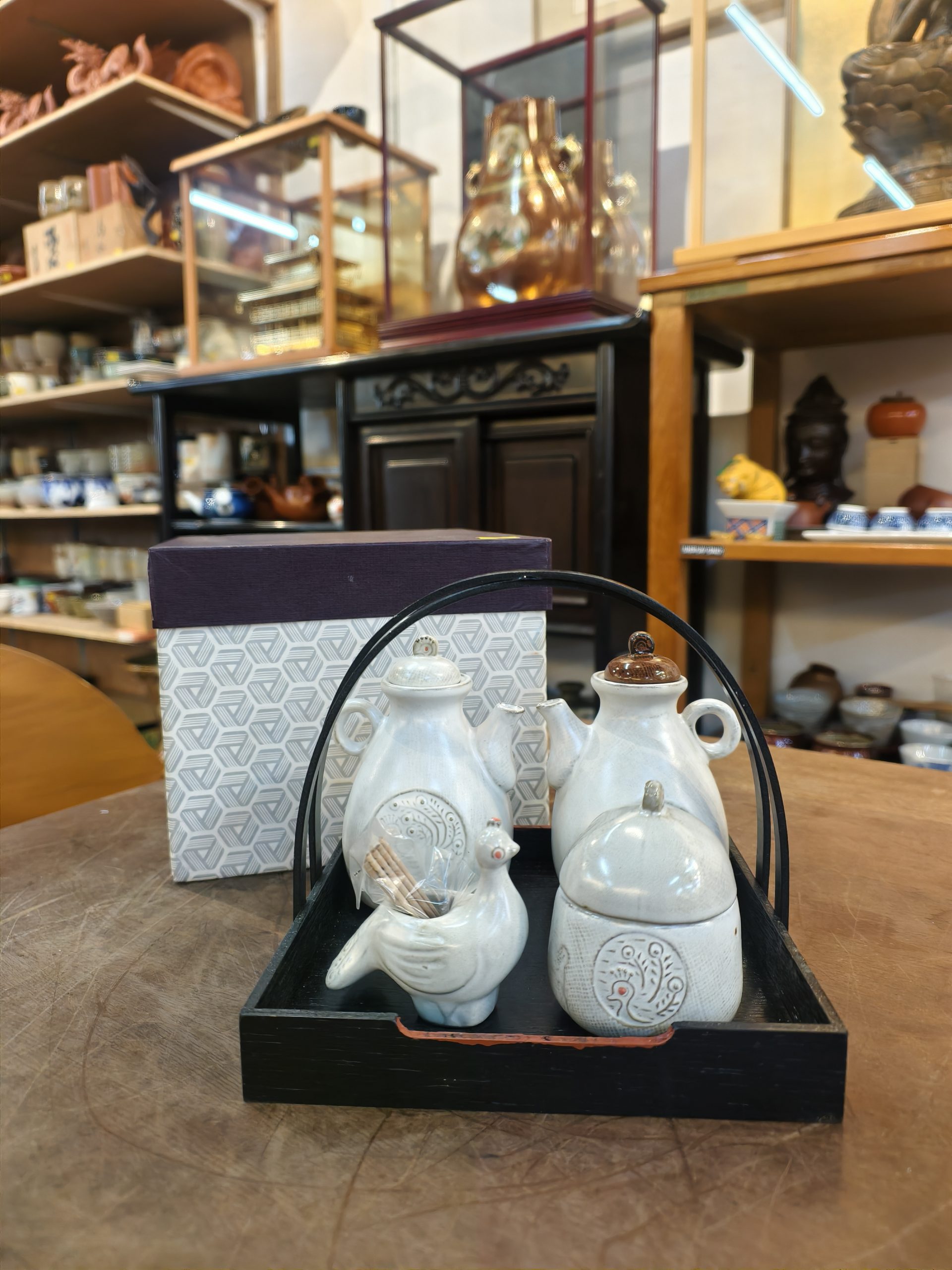 酱油仟 [陶土] [2酱油瓶1小盖物1牙签附加木托] [全新/盒装]Soy Sauce Set [Clay] [2 soy sauce bottles, 1 small container, 1 toothpick holder with wooden tray] [Brand new/boxed]